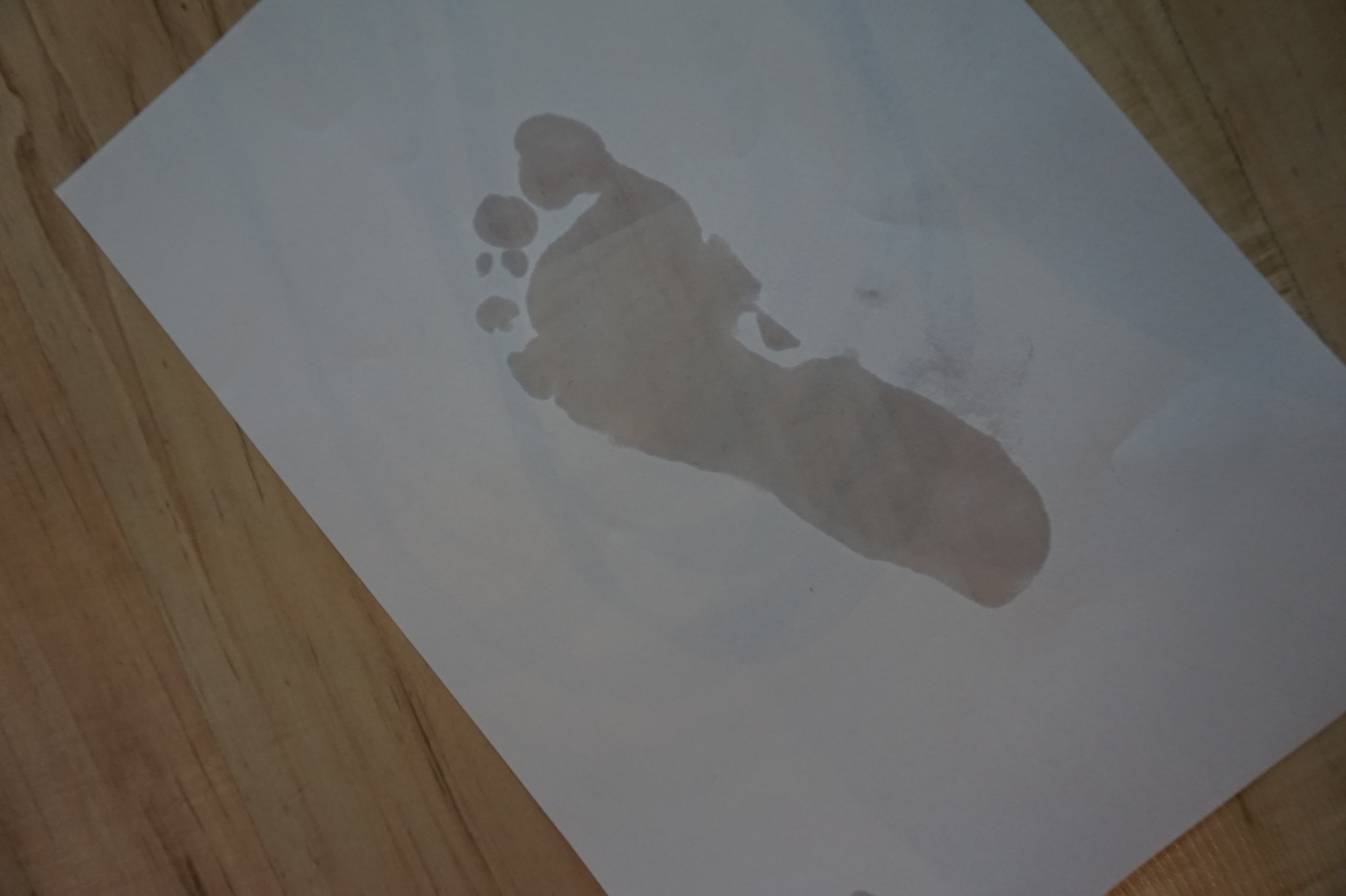 Należy pomalować dziecku stópki farbką (przeznaczoną do malowania ciała) bądź zwykłą oliwką dla niemowląt i odcisnąć ją na sztywnym papierze. Za pomocą dwóch równoległych linii zmierzyć ich największą (!) odległość.